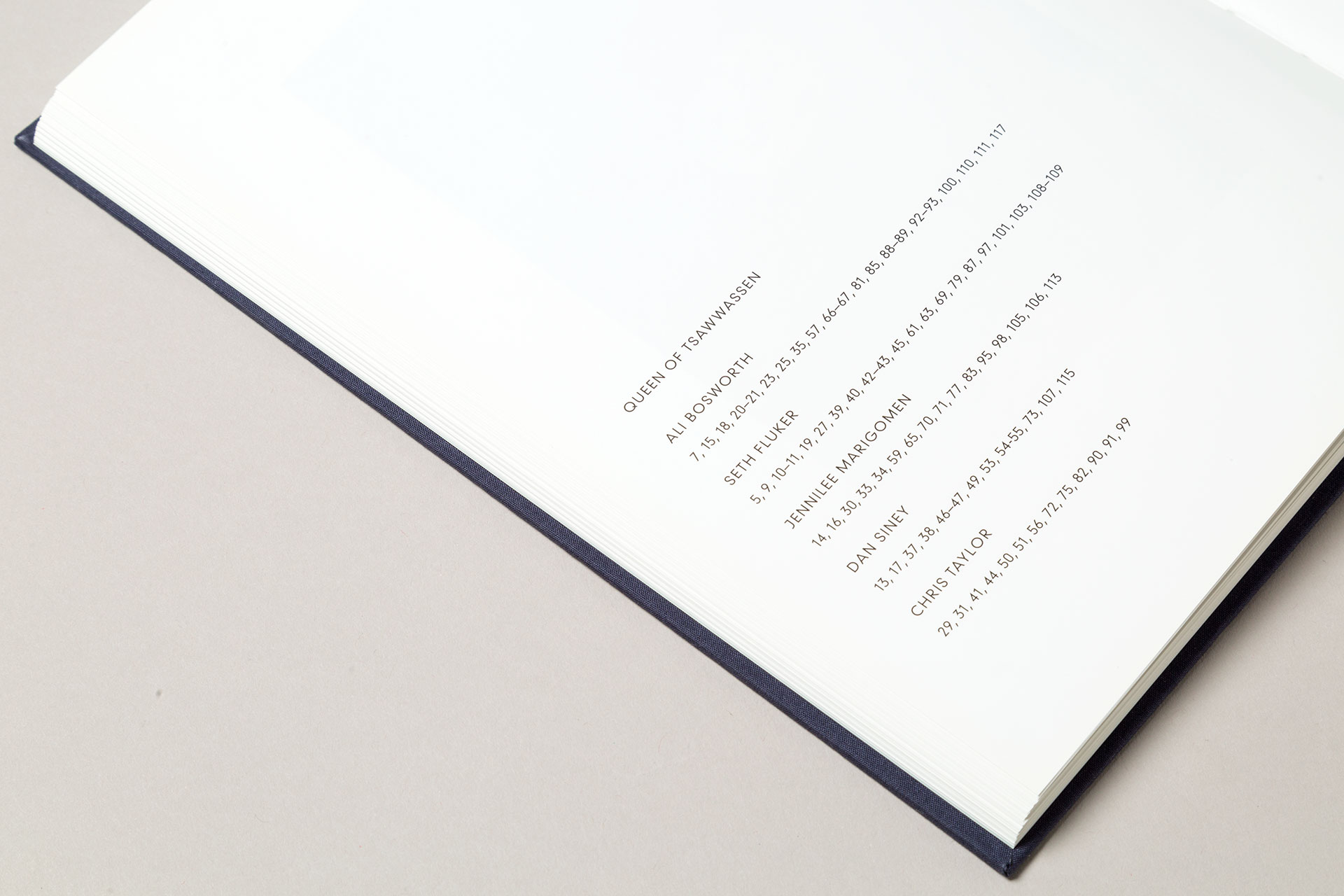 Produced in 2012 through a collaboration between twelvebooks and Inventory magazine, Queen of Tsawwassen is a 120-page casebound visual essay featuring five emerging Canadian photographers: Ali Bosworth, Seth Fluker, Jennilee Marigomen, Dan Siney, and Chris Taylor. Published as a limited edition of 500 copies, the book’s design creates a continuous harmony across the artists' diverse individual works.